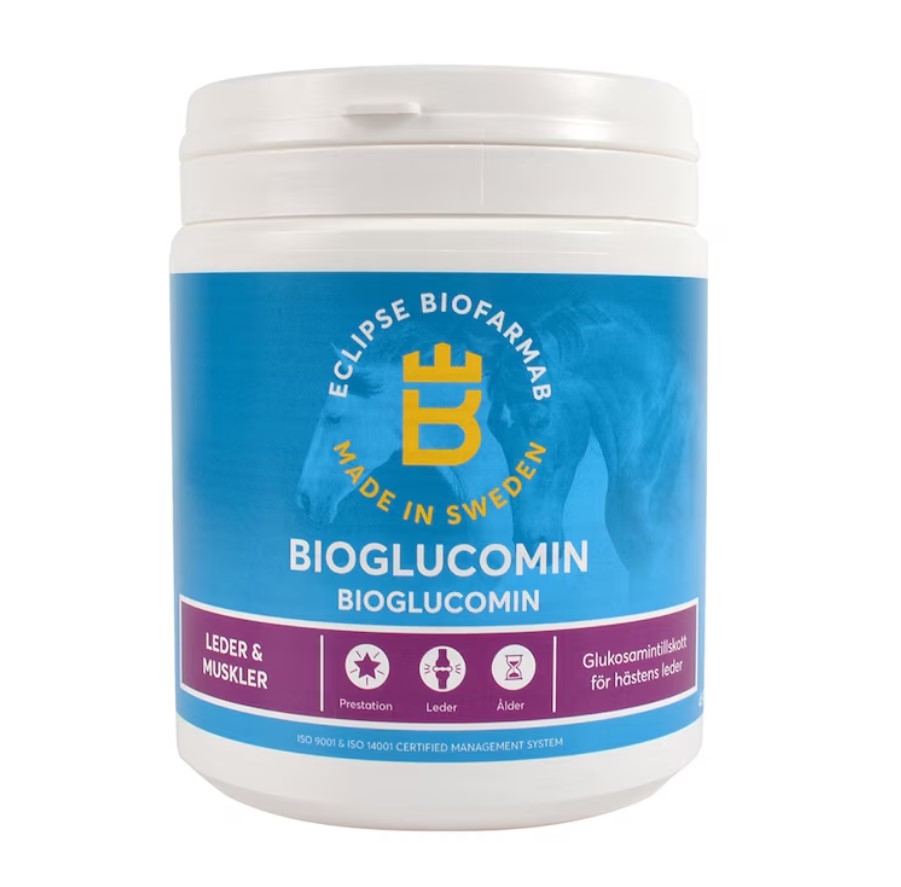 Glukosamin är en kroppsegen substans som är en viktig komponent i bildandet av senor, leder och brosk. Med stigande ålder eller hård träning minskar kroppens egen förmåga att producera tillräckliga mängder glukosamin. Bioglucomin innehåller glukosamin med hög koncentration med inulin och oligofruktos, som är en naturlig skaldjursprodukt, med extra hög absorption. 450 g = 30 dagliga doser. Dopningsfri Dosering: Häst upp till 600 gram 1 mått morgon och kväll. Häst över 600 gram 1,5 mått morgon och kväll. Ponny 0,5 mått morgon och kväll. Blandas i foder. 1 mått = 7,5 gram Finns i storlek: 450 gram = 399,- 2 kg = 1799,-