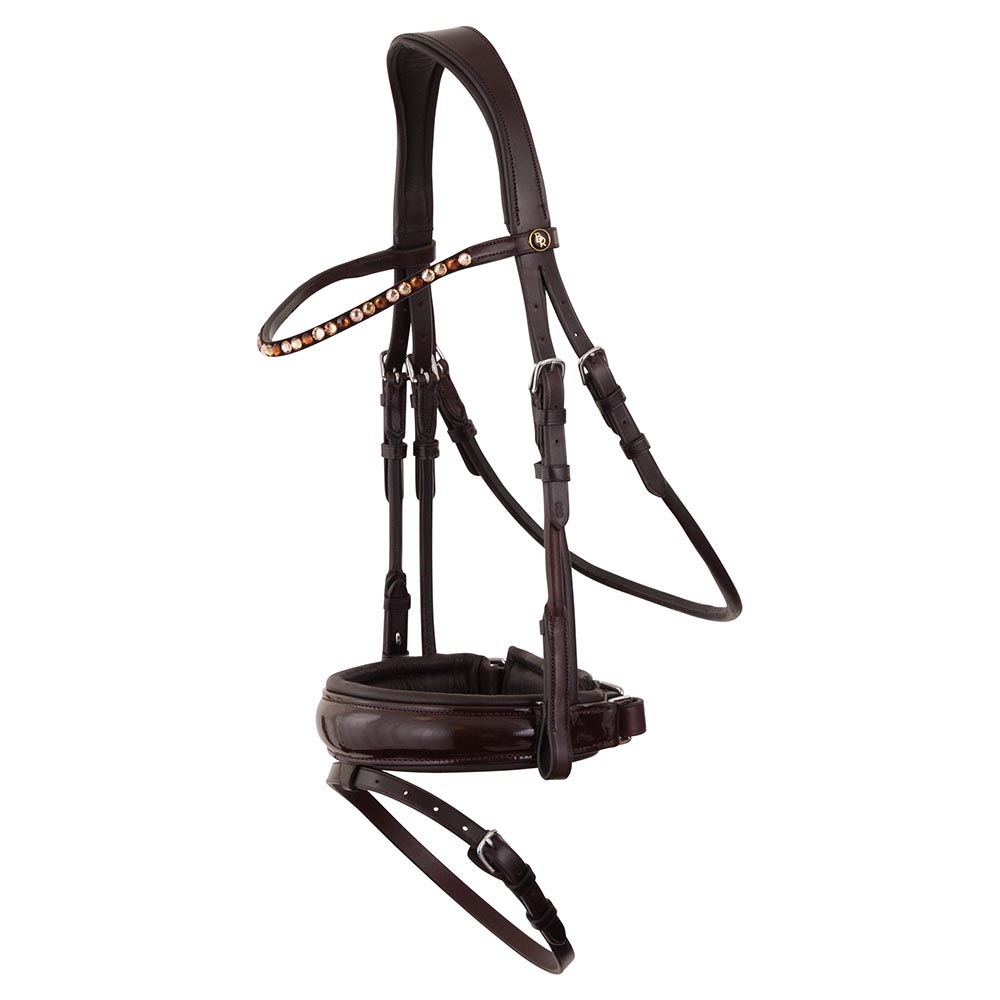 Tränset har ett fint lätt böjt pannband med swarowski-stenar i olika färger. Tränset har ett brett nosband med extra mjuk vaddering och glänsande lackyta.