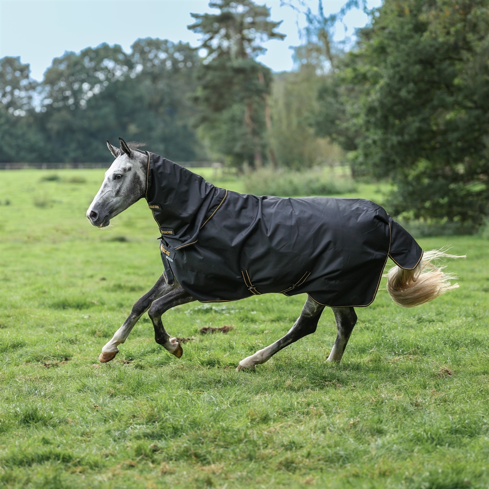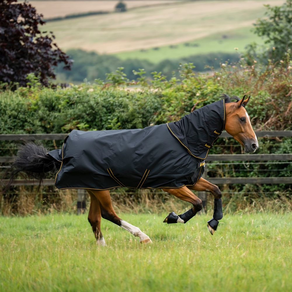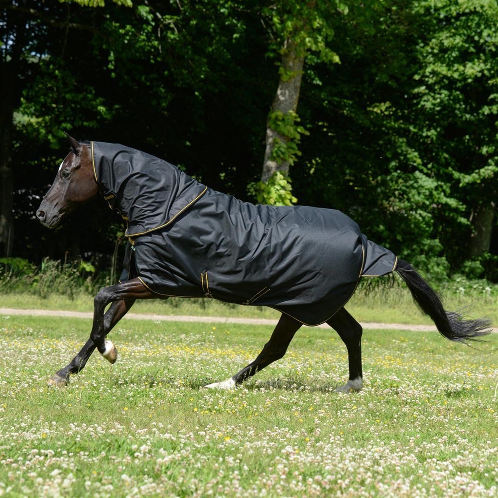 Täcket är tillverkat i superstarkt 1200 denier rip-stop-tyg, som är Teflon-belagt, vattentätt och samtidigt andningsbart. Det säkerställer att hästen förblir torr och bekväm – även under regniga och blåsiga perioder.