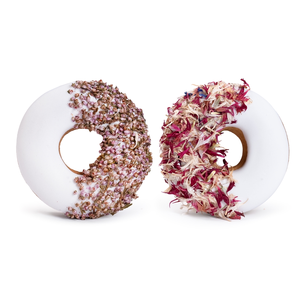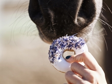 Donutsen är toppade med ljung (heather) och blåklint (cornflower), som inte bara ger ett fint färgspel, utan också bidrar med naturliga egenskaper som stödjer hästens välmående.