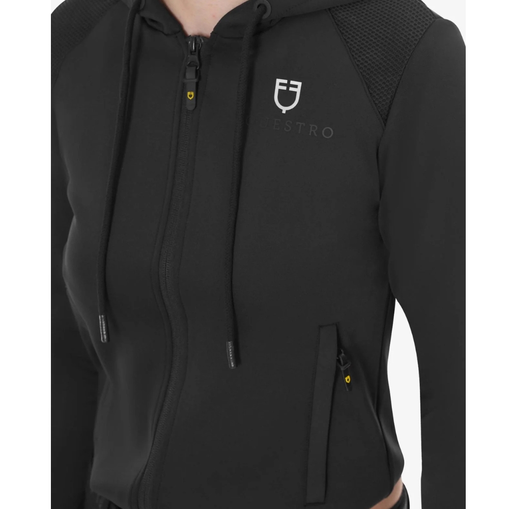 Huvtröjan har full dragkedja, justerbar huva med snöre samt elastiska muddar och midja för en perfekt och feminin passform. De två framfickorna med dragkedja ger praktisk förvaring, medan de stilrena Equestro-detaljerna – logotyp och bokstäver på bröstet samt en präglad logotyp på ryggen – fulländar den exklusiva looken.