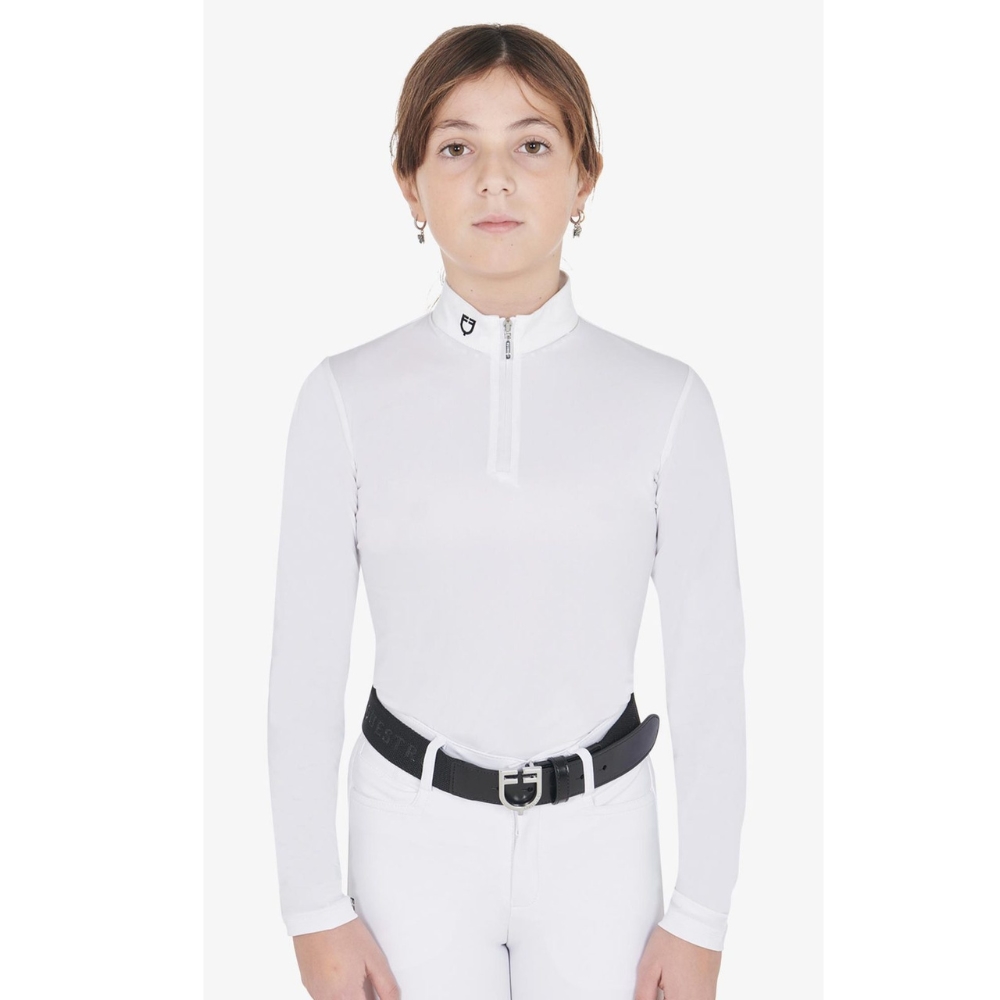 Elegant och funktionell långärmad slim fit tävlingspoloskjorta för flickor, tillverkad i ett tekniskt stretchmaterial som ger både maximal komfort och en utmärkt passform. Tyget är andningsbart, snabbtorkande och antibakteriellt, samtidigt som det ger fullt UV-skydd – perfekt för långa dagar på tävlingsplatsen.