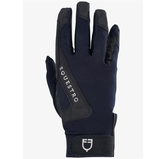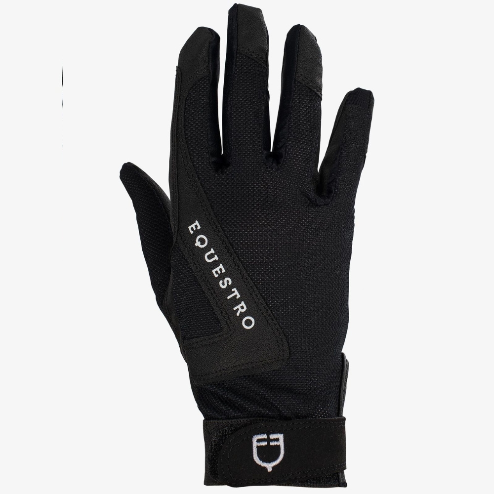 Baksidan och polyesterstängningen är dekorerade med Equestro-logotyp och text, vilket ger handskarna ett sportigt och modernt uttryck.