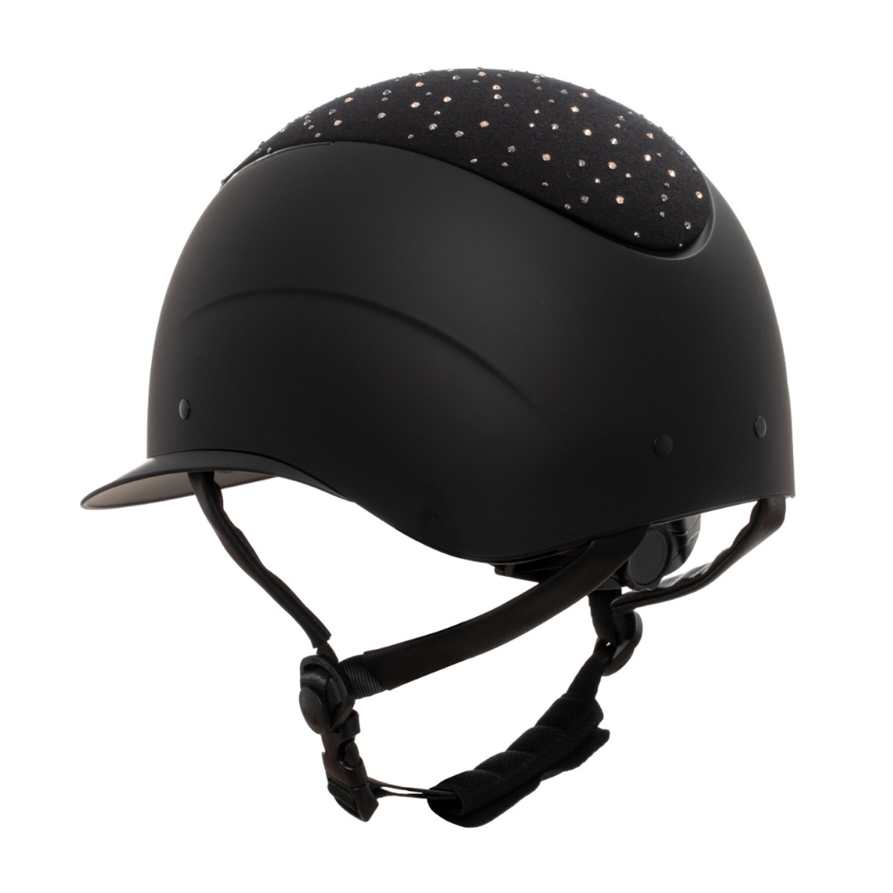Det matta ytterskalet är dekorerat med gnistrande strass, som bildar den ikoniska Equestro-logotypen runt de främre ventilationsöppningarna. Tillsammans med den glänsande ramen får hjälmen ett lyxigt och raffinerat uttryck – perfekt för ryttaren som vill kombinera säkerhet med stil.