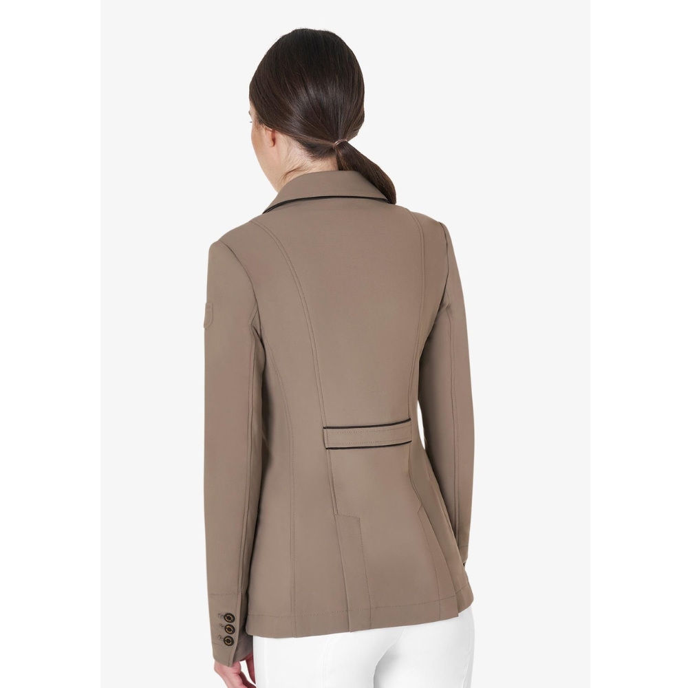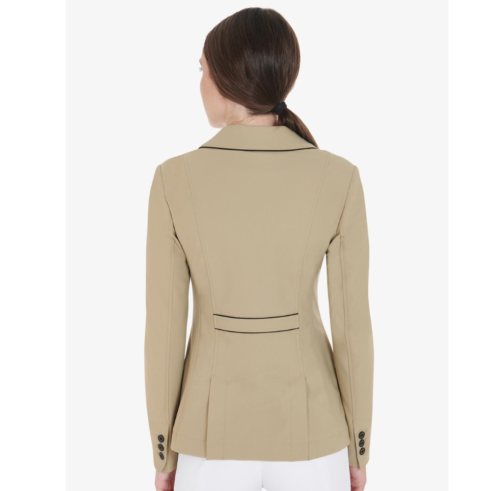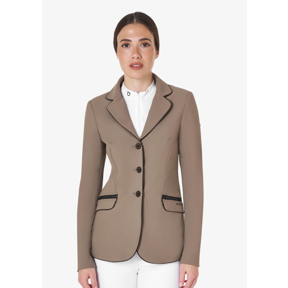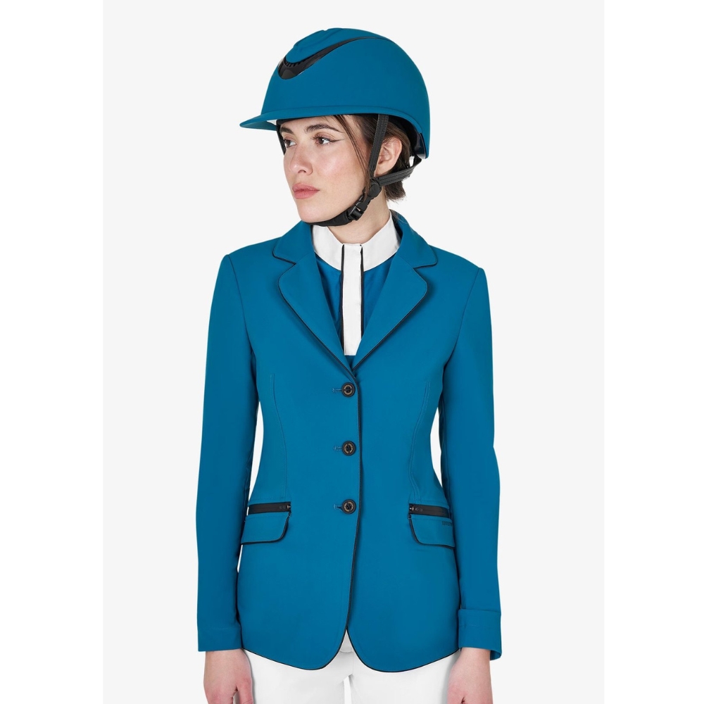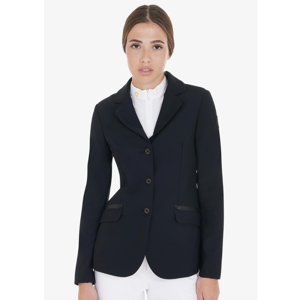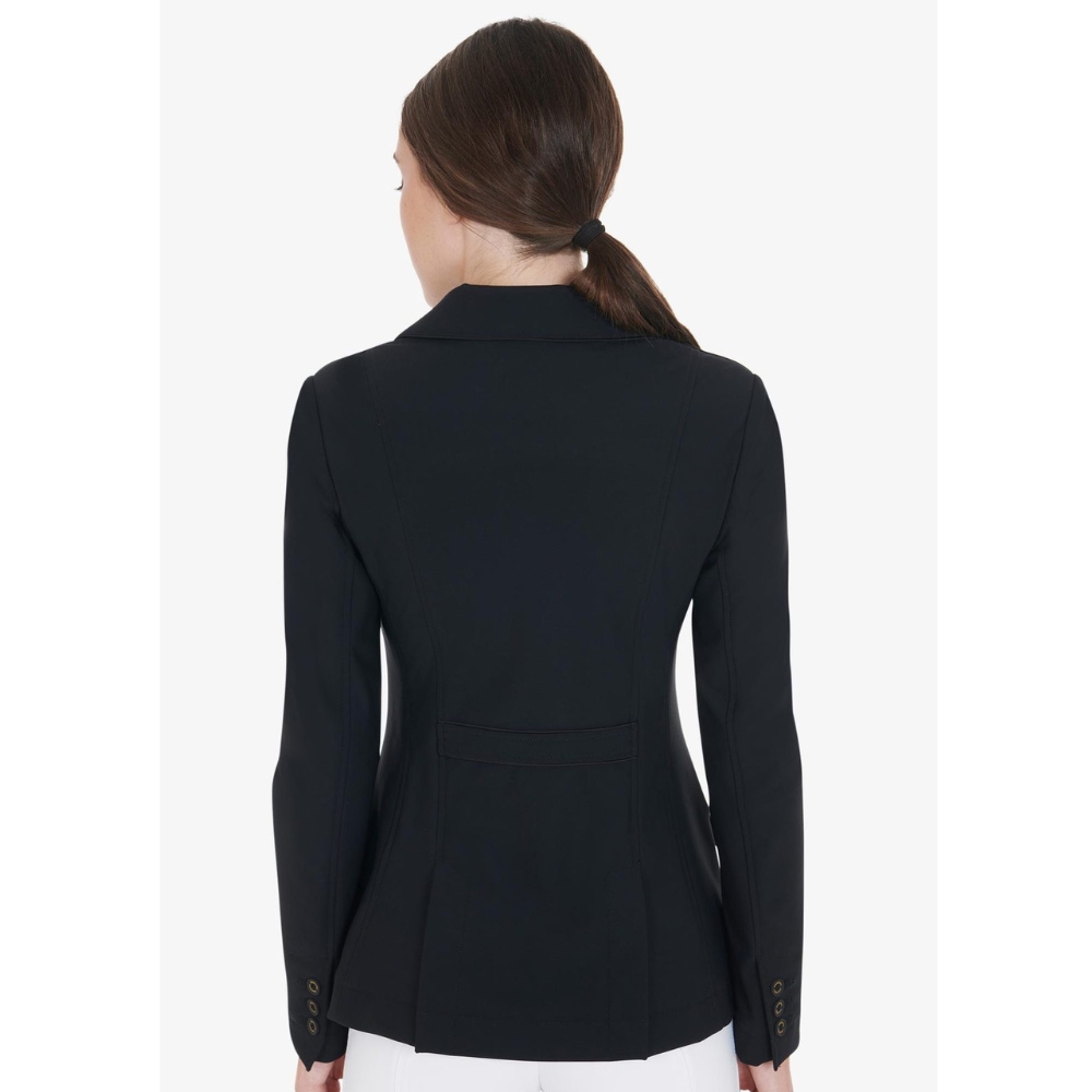 Denna eleganta tävlingskavaj för kvinnor kombinerar klassisk stil med modern prestanda. Kavajen är tillverkad i lätt och perforerat tekniskt tyg, som säkerställer maximal andningsförmåga, ventilation och rörelsefrihet – idealisk för både varma tävlingsdagar och intensiv ridning.