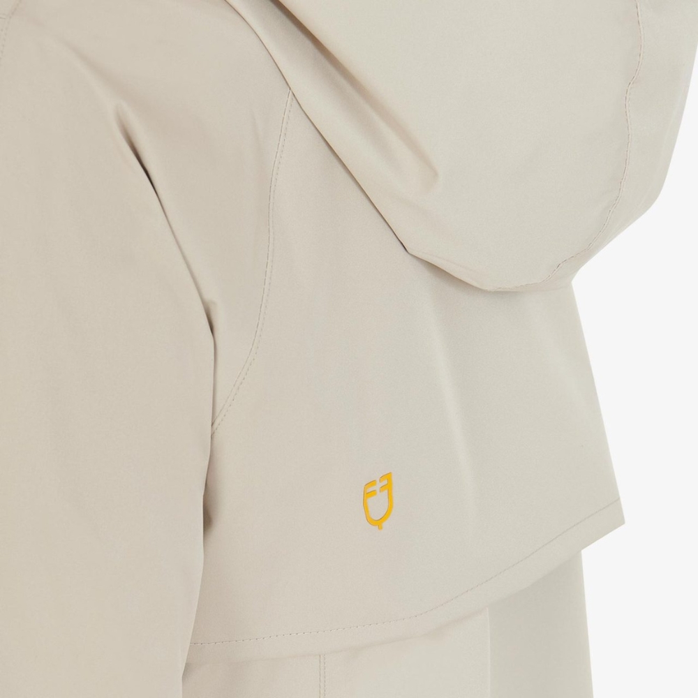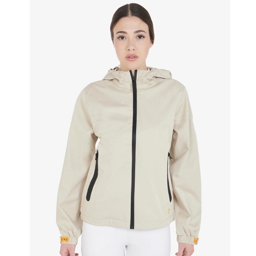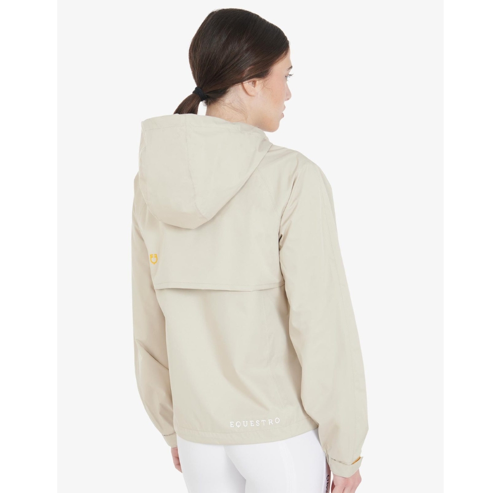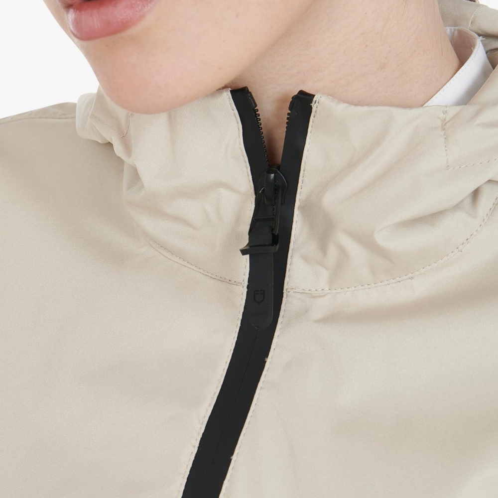 Upplev toppkvalitet och smart funktionalitet med Equestros tekniska regnjacka för kvinnor. Jackan är tillverkad i ett trelagers tekniskt material med en andningsbar och vattenavvisande membran, som säkerställer den perfekta balansen mellan skydd och komfort – idealisk för både träning, stallarbete och ridning i ostadigt väder.