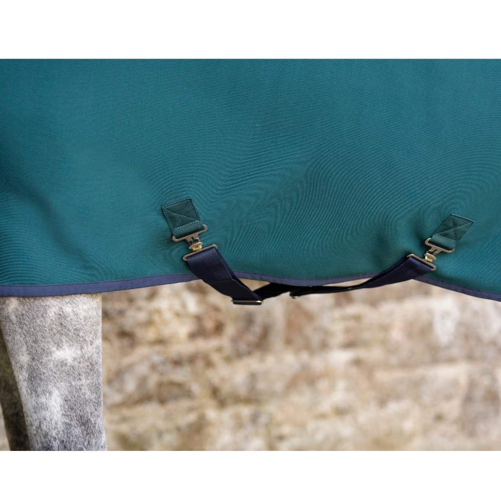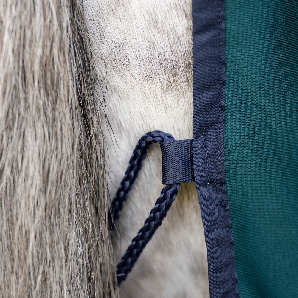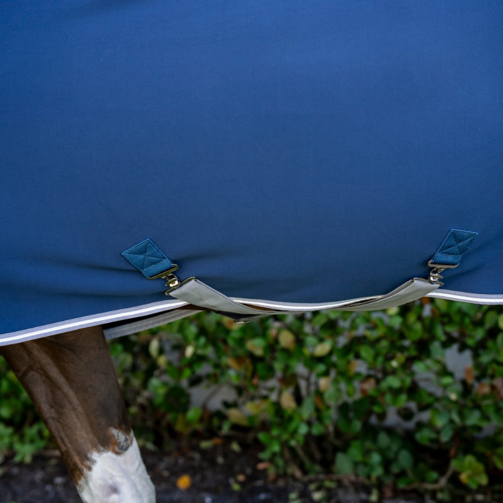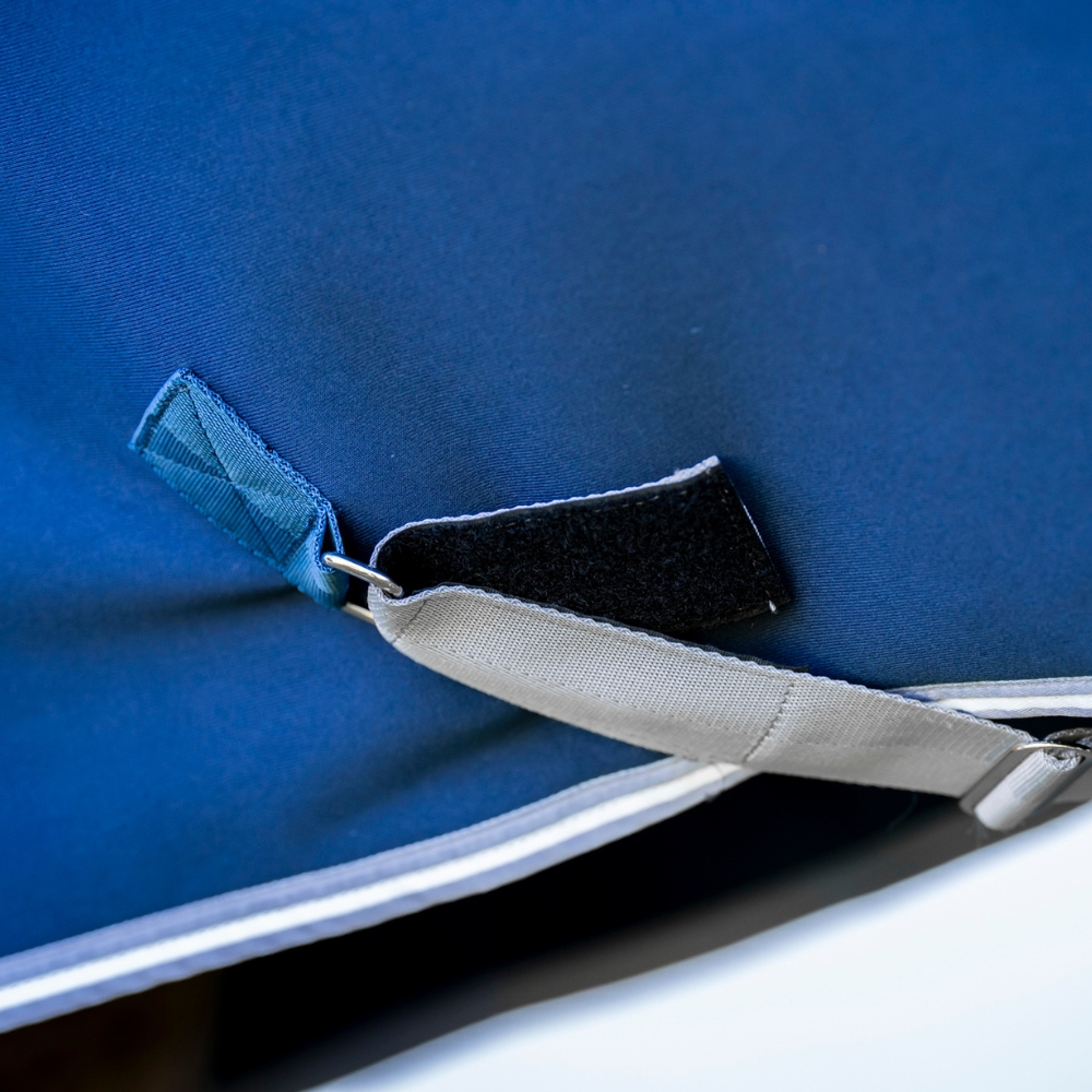 Täcket är utrustat med en säker frontstängning, avtagbara gjordstroppar och en svansrem, som ger flexibilitet och gör det enkelt att anpassa täcket efter behov.