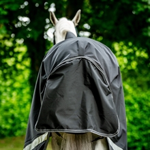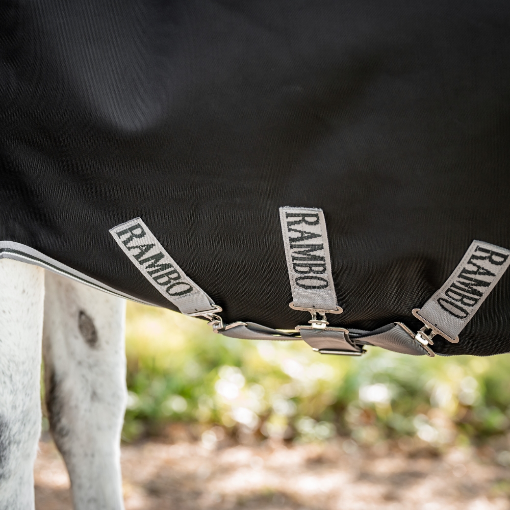 Rambos kända kvalitets hästtäcken i supertålig 1000 Dn. ballistic nylon med halv hög hals och 200 gram fiberfyllning samt nylonfoder för att förhindra slitning på hästens bringa.