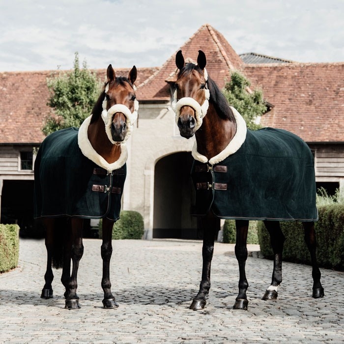 Kentucky fleece show rug heavy i den vackra färgen Pine Green har ett ull-liknande utseende och en mjuk krage i imiterad lammull för optimal komfort för hästen, samtidigt som det ser exklusivt ut.