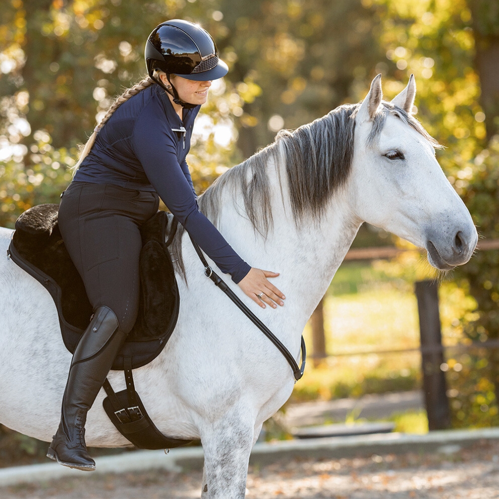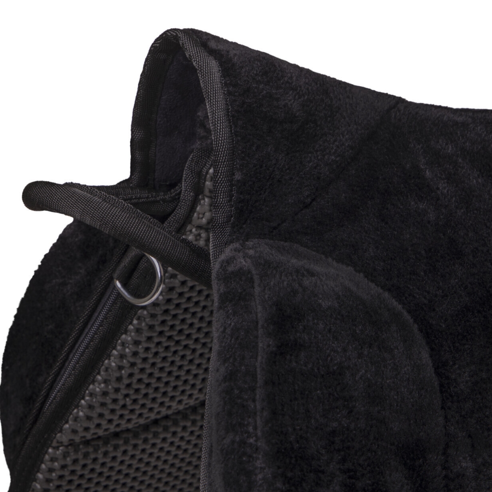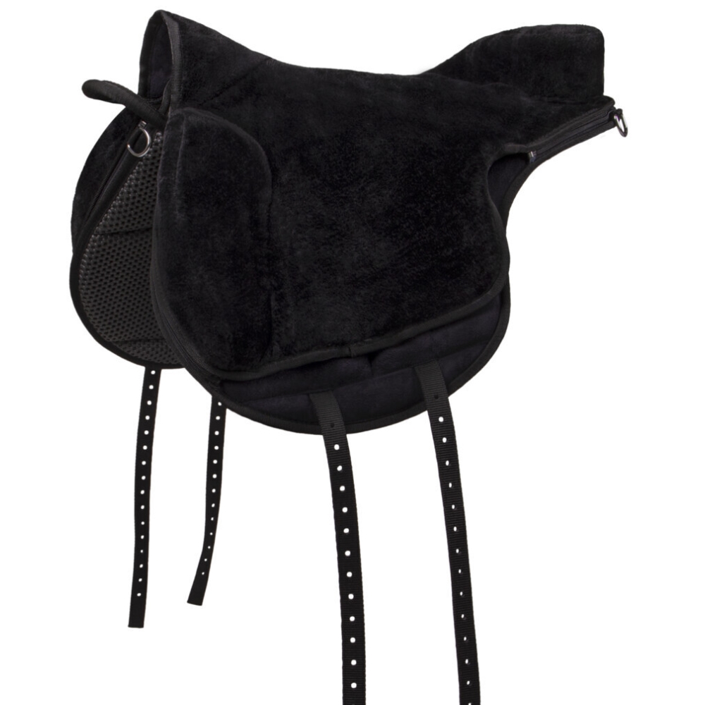 Baksidan är i antiglidgummi, så den ligger stadigt på underlaget. Fram finns det en greppstopp. Anatomisk passform med utrymme för manken. 2 långa gjordstroppar på varje sida. Ovansidan i syntetisk päls, som kan dras av med dragkedja om du vill rida utan det, eller när det ska tvättas. D-ringar i rostfritt stål, både fram och bak.