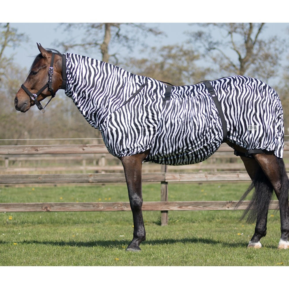 QHP Eksemtäcken med fast hals, justerbar magplatta, och en bred svansflik. Eksemtäcket har en stängning mellan frambenen för att fästa den breda magplattan, samt elastiska justerbara benremmar och en bred svansflik. Dessutom är eksemtäcket gjort i andningsbart tyg, som samtidigt är elastiskt, vilket gör att det kan sitta nära kroppen och skydda så mycket som möjligt. Täcket är gjort av 100% polyester. Eksemtäcket har dessutom UV-skydd. Täcket kan maskintvättas på 30 grader. Täcket ska tvättas i en tvättpåse och alla spännen ska vara stängda. Det ska inte användas sköljmedel och täcket får inte torktumlas. Täcket kan kombineras med QHP Eksemmaske (artikelnummer 6813) Finns i färg: Brun - Zebra Finns i storlekar: 75 - 85 - 90 - 100 - 105 - 110 - 115 - 125 - 135 - 145 - 155 -165 - 175 cm