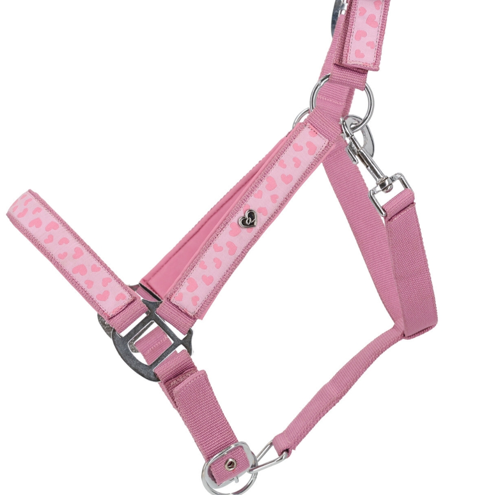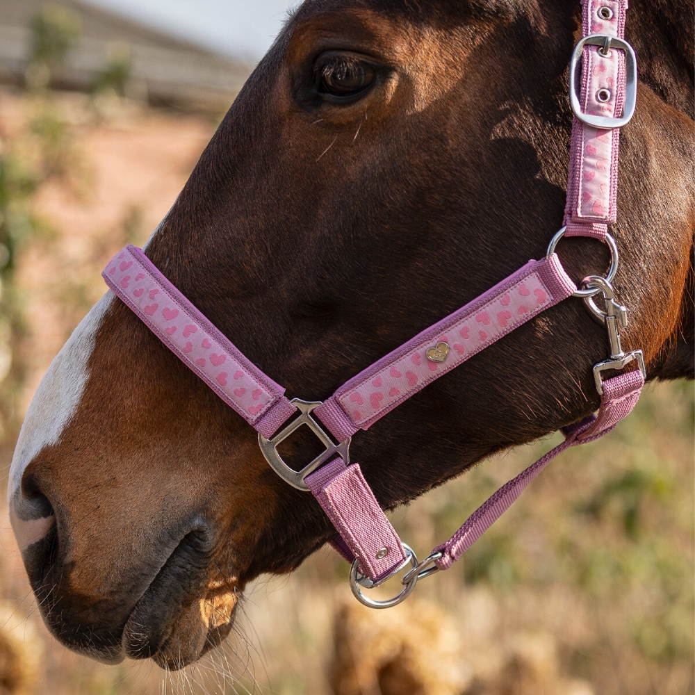 Denna charmiga grimma från Lyvia-kollektionen kombinerar funktionalitet och en söt design med små hjärtan. Grimman kan justeras både vid nackstycket och nosremmen, så du enkelt kan uppnå den perfekta passformen för din häst eller ponny.