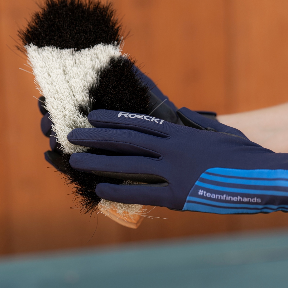 Handskarna fästs enkelt runt handleden med en kardborreförslutning på handflatesidan, och som en detalj finns hashtaggen #teamfinehands, för att påminna ryttaren om att ha en stilla hand.