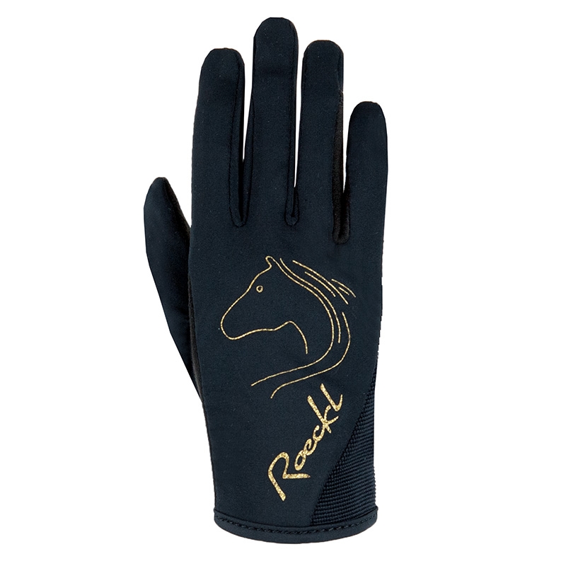 Roeckl Tryon är en härlig barnridhandsker i bekväm lycra med perfekt passform, och ett vackert hästmotiv i glittertryck på ovansidan.