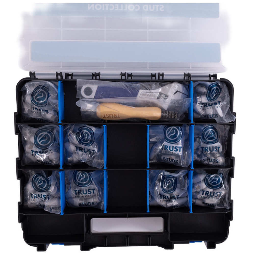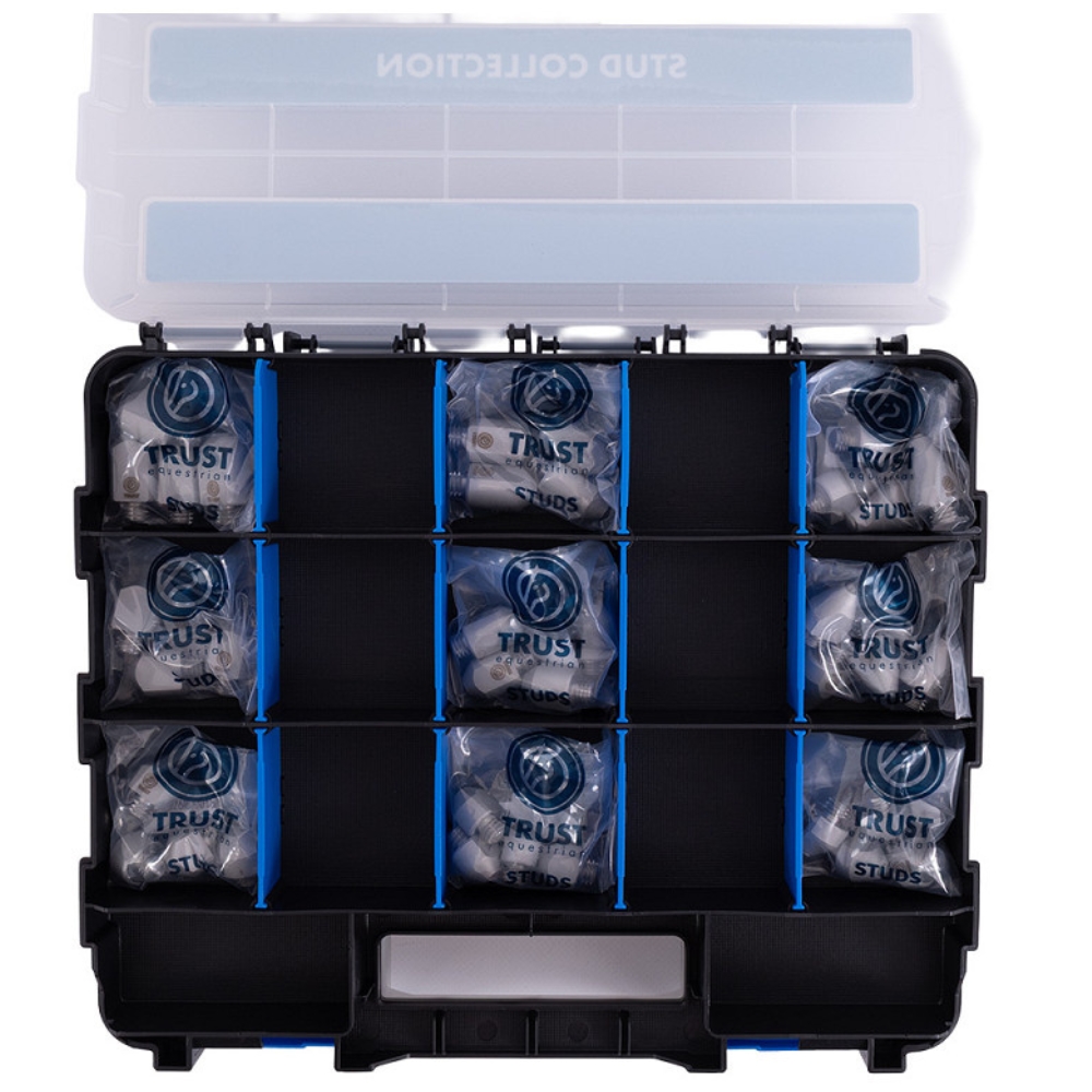 TRUST Stud Box Collection är det ultimata setet för den erfarna hopp- eller fälttävlansryttaren. Med 99 högkvalitativa broddar i olika former och storlekar är du redo för alla typer av underlag – från torrt gräs till djup och våt terräng.